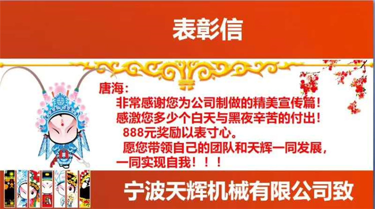為鼓勵天輝機(jī)械員工的主人翁精神!特為一直為公司宣傳視頻付出努力的技術(shù)負(fù)責(zé)人唐海準(zhǔn)備了一封現(xiàn)金紅包獎勵,以此感謝他為公司的付出!